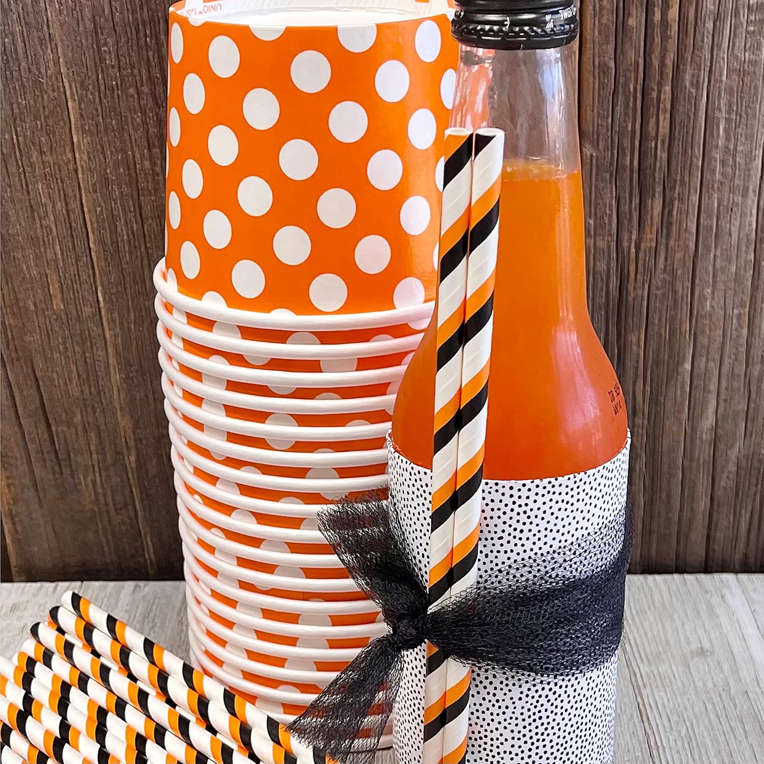 Δώσε χρώμα και στυλ στα ροφήματά σου με αυτά τα εντυπωσιακά ριγέ χάρτινα καλαμάκια σε μαύρο και πορτοκαλί χρώμα! Ιδανικά για Halloween πάρτι, θεματικά τραπέζια ή για να στολίσουν γλυκά, cupcakes και cake pops.